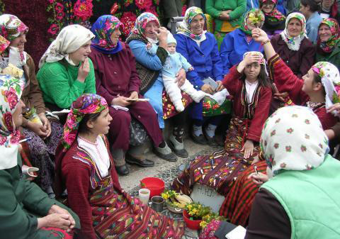 Οι μεσήλικες και οι γέροι καβάλα πάνω σε άλογα με πολύχρωμες βελέντζες και πουστακίδες [βαμμένα δέρματα], στολισμένες σέλλες και σαμάρια, όλοι μαζί, από όλα τα χωριά, συγκεντρωνόταν στα Λουτρά Θερμών. Εκεί συνευρίσκονταν μία φορά το χρόνο και γιόρταζαν, ενώ η κοινότητα πρόσφερε από μία φέτα ψωμί, τυρί και χαλβά σε όλους τους κατοίκους που μαζεύονταν στα Λουτρά.